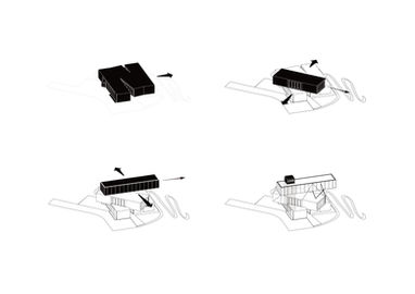 모도–회동리를 잇는 바닷길 축, 해안선과 평행한 수평 경관축, 일출을 정면으로 받아들이는 정동향 축은 매스 구성의 기준이 되어 진도의 바다·섬·산을 다층적으로 통합한다. 경관축을 반영해 분절·정렬된 매스는 해안선, 섬의 실루엣, 바닷길의 흐름, 산의 배경을 서로 다른 각도와 높이에서 포착하는 공간 장치이며, 어긋나며 적층되는 형태는 경계의 시간성과 드러남과 사라짐의 리듬을 은유한다.